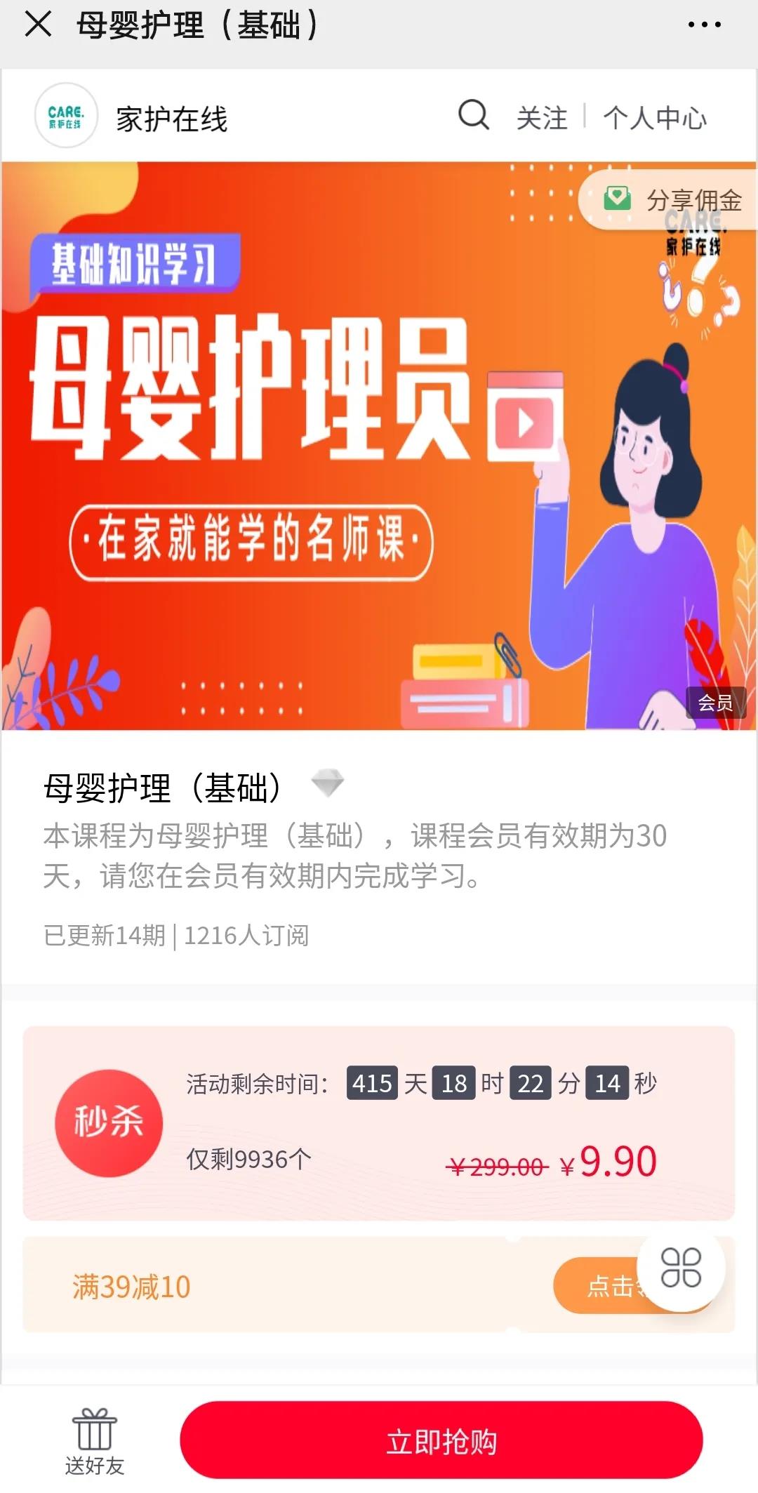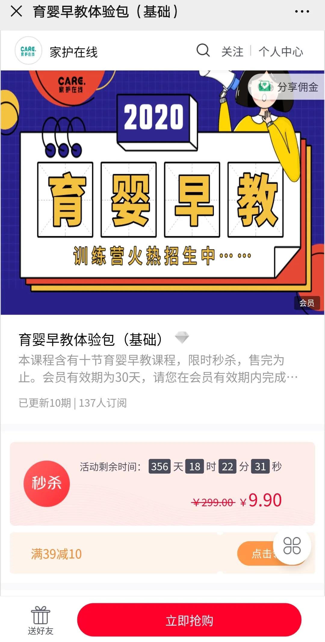 家护在线通过线上9.9引流课程、线上学习抵扣线下学费、限时秒杀等活动帮助线下培训机构进行招生培训。